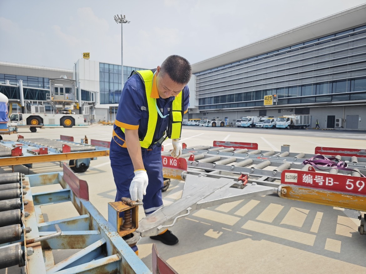 烈日下,國內(nèi)貨站外場牽引車司機(jī)高立明正俯身檢查掛板拖的牢固程度。他一邊擦拭著額頭的汗水,一邊說道:“高溫天氣不僅要做好自身防暑,車輛、設(shè)備的安全檢查更要嚴(yán)格。在機(jī)坪作業(yè),容不得半點(diǎn)馬虎。”說著,他又仔細(xì)確認(rèn)了一遍連接處的安全鎖扣。