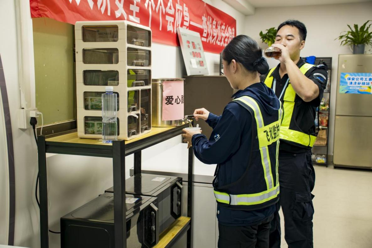 為切實做好防暑降溫工作,保安公司延伸防暑關(guān)懷措施,通過班組會、交班會等形式強(qiáng)化員工防暑安全教育,在休息區(qū)設(shè)置健康提示欄,供應(yīng)酸梅湯等解暑飲品;根據(jù)高溫預(yù)警動態(tài)調(diào)整員工輪崗時間,避免員工高溫時段長時間露天作業(yè);同時充分發(fā)揮工會“心聲墻”等作用,持續(xù)收集員工意見,營造安全舒心的工作環(huán)境,護(hù)航員工以最佳狀態(tài)保障機(jī)場安全運(yùn)行和旅客平安出行。