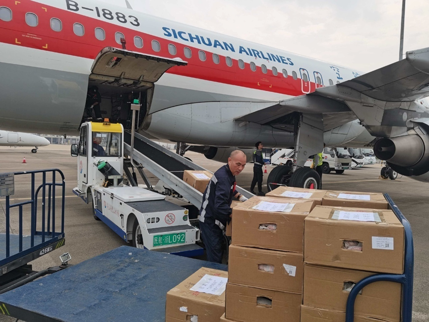 自航空物流完成首輪測(cè)試以來(lái),舟山與達(dá)州之間的航線不僅方便了人員往來(lái),更成為物產(chǎn)高效流動(dòng)的“生命線”。在達(dá)州起飛航班的貨艙中,常常滿是新鮮蔬菜、瓜果、松茸,以及散養(yǎng)土雞、優(yōu)質(zhì)蜀宣花牛肉等農(nóng)特產(chǎn)品。它們?cè)?jīng)困于山水阻隔、運(yùn)輸漫長(zhǎng)、保鮮困難,難以走出大山;如今,卻能在24小時(shí)之內(nèi)“飛”入舟山市民的廚房。